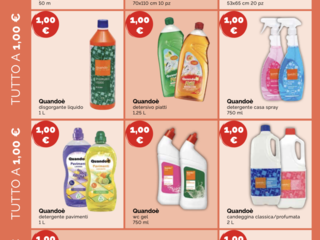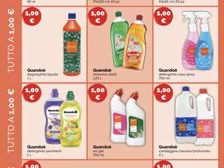 - Quandoè detergente pavimenti, candeggina, piatti e WC gel;