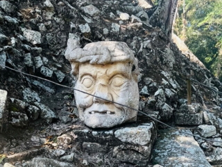 Le prime rovine compaiono dopo pochi passi: muri bassi, scalinate, figure scolpite. Le steli raccontano re e dei, vite che si sono fatte pietra. Una, più imponente, raffigura “18 Conigli”, il sovrano che fece di Copán un centro d’arte e spiritualità. Il suo volto, scolpito con un’eleganza che sfida l’erosione, guarda ancora verso l’orizzonte. Più avanti, la Scalinata dei Geroglifici si erge come una montagna di simboli. I glifi, incisi nei gradini, narrano storie di dinastie, battaglie, sacrifici. Alla base, figure mitiche sorreggono la struttura, come se la fede avesse ancora un peso fisico. Intorno, la giungla osserva in silenzio. Gli uccelli volano bassi, custodi inconsapevoli di un’eredità millenaria. Il vento muove appena le foglie, e per un momento tutto sembra tornare al principio: la pietra, la selva, il respiro della terra. Camminando si percepisce un equilibrio raro, una continuità tra natura e memoria. Copán non parla ad alta voce: sussurra, e chiede ascolto. È un luogo dove il passato non si mostra, ma si lascia intuire, come un’eco nel verde.