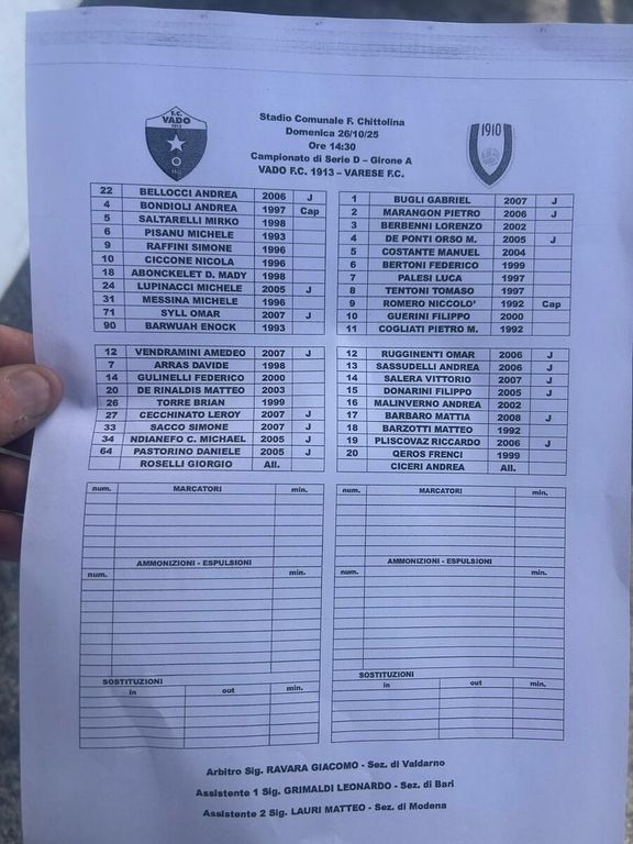 Ci siamo: Vado-Varese può lasciare il segno, come già accaduto nelle ultime stagioni. Dalle 14.30 vi raccontiamo in diretta la partitissima dallo stadio Chittolina di Vado Ligure tra la capolista allenata dal grande ex Giorgio Roselli, plurivincente a ogni livello anche nello stesso Varese a fine anni Novanta (promozione in C1), e i biancorossi di Ciceri staccati di 6 punti dalla vetta. Negli ospiti, sostenuti da un grande seguito anche oggi, manca il solo Bruzzone al centro della difesa causa squalifica (è recuperato, però, e parte titolare Bertoni), mentre Roselli deve fare a meno di Vita e Arras (quest'ultimo in panchina), pur disponendo di molte altre bocche da fuoco. Gli ospiti partono confermando Guerini, Cogliati e Romero davanti.