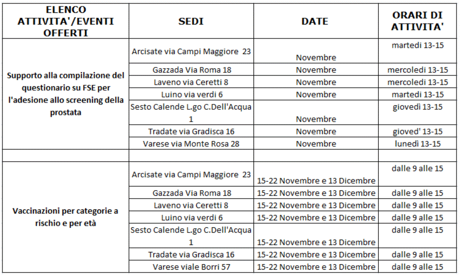 Inoltre, nei giorni 15 e 22 novembre e il 13 dicembre, dalle 9:00 alle 15:00, in tutti i Centri vaccinali di ASST Sette Laghi saranno garantite, con accesso libero, le vaccinazioni raccomandate per le categorie a rischio e per età.