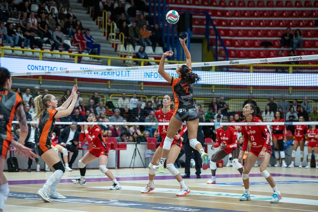 Nel secondo set confermata Battista in posto 4 al fianco di Gennari, e la musica cambia subito. L’ace di Obossa vale il 6-3, poi l’opposta biancorossa si scatena al servizio e in attacco: 7-3, 10-3, con Gennari a dare equilibrio e sicurezza. Busto ora gioca con ritmo e convinzione, mentre l’ex di turno Battista si fa valere con un gran diagonale nei tre metri per il 14-5. Le farfalle volano via fino al 19-9, poi ancora doppietta di Battista per il 22-13. Obossa mette la firma sul set ball (24-13) e chiude subito dopo: 25-13. Numeri da urlo per l’opposta bustocca, che nel parziale tocca l’88% in attacco. E mentre all'e-work Arena si festeggia il ritorno in parità, nel parterre si rivede anche un volto noto: Rebecca Piva, ex biancorossa oggi alla Vero Volley Milano, passata a salutare le compagne dopo il netto 3-0 inflitto nel pomeriggio al Monviso Volley.