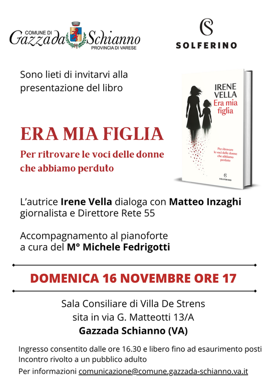 Domenica 16 novembre, alle ore 17, presso la Sala Consiliare di Villa De Strens, sarà presentato il libro “Era mia figlia” di Irene Vella.