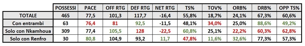 Si è passati poi (dal minuto 20:25) all’analisi statistica su un dibattito tecnico in corso tra i tifosi, ovvero quello della convivenza o meno dei due lunghi in casa Openjobmetis: Nkamhoua e Renfro. Si è andati ad analizzare i dati statistici della squadra quando i due sono in campo insieme, quando c’è solo l’ala finlandese e quando c’è solo il lungo americano (tabella in fondo all’articolo).