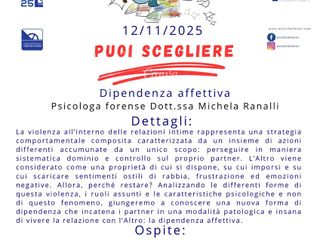 L’ultimo dei sette incontri previsti è in programma per la sera di mercoledì 12 novembre, e avrà come tema principale, appunto, quello della dipendenza affettiva, una questione di strettissima attualità e spesso tristemente alla ribalta per casi di cronaca.