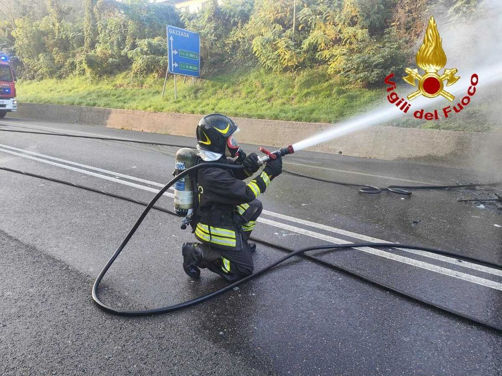 L'allarme è scattato questa mattina alle 8 nei pressi dello svincolo dell'Autolaghi. Sul posto i vigili del fuoco, che hanno domato l'incendio. L'uomo portato in ospedale per accertamenti