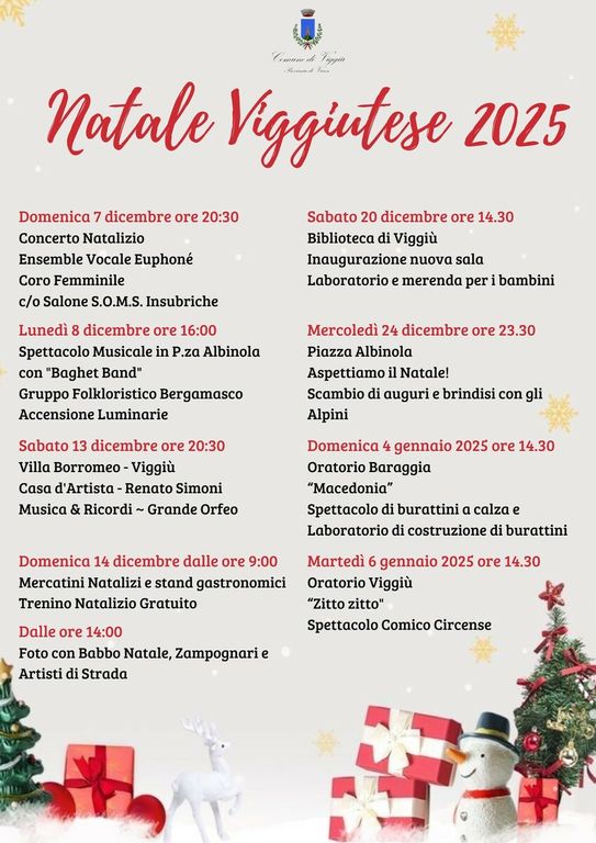 Anche Viggiù si prepara a vestirsi a festa, e per il periodo natalizio organizza una serie di eventi che riempiono il calendario dal 7 dicembre al 6 gennaio.