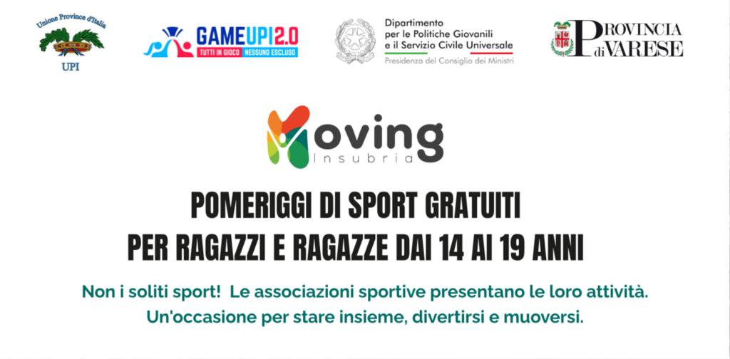 Prosegue con entusiasmo l’esperienza di INSUBRIA M.O.V.I.N.G. (Movimento, Opportunità, Valorizzazione, Inclusione: Nuove Strategie per i Giovani), il progetto che unisce sport, socialità e inclusione promosso nell’ambito di GameUPI 2.0 – Tutti in gioco, nessuno escluso, iniziativa promossa dalla Provincia di Varese, come ente capofila, nell’ambito del progetto nazionale “Game Upi 2.0 – Tutti in gioco, nessuno escluso”, finanziato dal Dipartimento per le Politiche Giovanili e il Servizio Civile Universale e coordinato da UPI – Unione Province d’Italia.