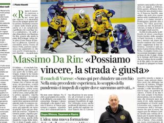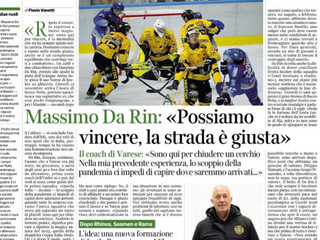 Il Varese di Massimo Da Rin, che ha ripetuto anche nella bellissima intervista sul Corriere della Sera a Flavio Vanetti, il maestro (la trovate sotto allegata all'articolo), di essere qui per chiudere un cerchio («Il suo bello è l'entusiasmo, vede sempre il bicchiere mezzo pieno» ha scritto proprio l'intervistatore dell'intervistato), è lì, in agguato, quatto quatto, e tutti sanno che non dovranno trovarselo tra i piedi nei momenti che contano, soprattutto con un "mostro" come Terzago, ed è qui, nei cuori gialloneri che battono, ribattono e domani scapperanno dal petto e scivoleranno in pista, dove devono essere, sempre. E dove potremo anche perdere (con l'Aosta, l'Alleghe e il Caldaro, per mille e un motivo, su può vincere, ma anche perdere), ma a modo nostro. E non come volevano imporci dalla panchina un anno fa, strappandoci l'anima.