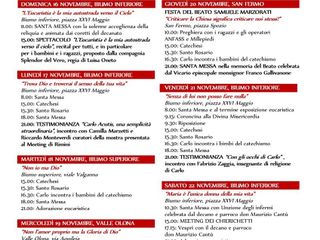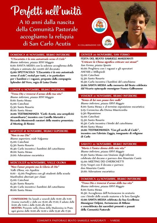 Si inizierà sabato 15 novembre alle ore 16.00 con l’inaugurazione della mostra “Carlo Acutis, una semplicità straordinaria”, presentata al Meeting di Rimini. La mostra, collocata nella chiesa della Madonnina in Prato sarà aperta pubblico tutti i giorni fino alla mattina del 23 novembre dalle ore 10:00 alle ore 12:00 e dalle ore 15:30 alle ore 17:30. Lunedì 17 alle ore 21:00 un momento speciale, con l'incontro con Camilla Marzetti e Riccardo Monteverdi, curatori della mostra presso la Chiesa SS Pietro e Paolo in Biumo inferiore, piazza Ventisei Maggio 12.
