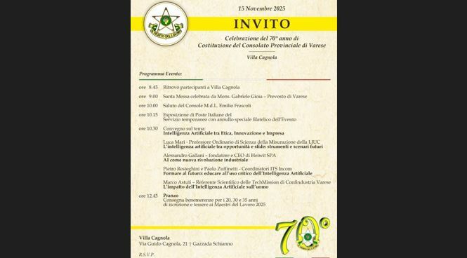 Una storia lunga settant’anni che non parla solo di passato, ma di futuro. Il Consolato Provinciale dei Maestri del Lavoro di Varese celebra il suo anniversario con una giornata che unisce memoria, innovazione ed etica, nella suggestiva cornice di Villa Cagnola a Gazzada Schianno. Un evento che non guarda solo indietro, ma sceglie di ispirare le nuove generazioni al valore autentico del lavoro.