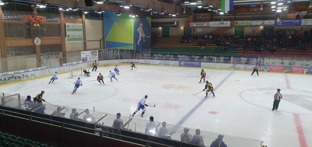 Quel bandierone giallonero sventolato dalla notte all'Alba di Canazei accoglie una squadra capace di inglobare le cinque assenze nella pancia di un gruppo meraviglioso, esaltata dalla mano di Massimo Da Rin che, di fronte alla linea con i cannonieri del campionato Salo e Mikhnov, letteralmente cancellata dal ghiaccio, costruisce un piccolo capolavoro tattico fatto di intensità, resistenza, pressing, raddoppi, dischi rubati e sventolate fulminee in contropiede di giocatori che parevano tutti uguali, senza volto e senza nome, nel coprire un compagno, nel posizionarsi nel terzo difensivo e in quello neutro impedendo anche alle mosche di circolare, bastoni e corpi a coprire, presidiare, blindare.