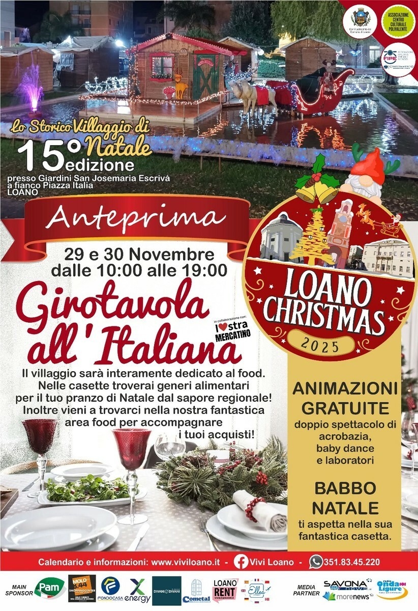 L’attesa atmosfera natalizia torna a illuminare i Giardini San Josemaria Escrivá, accanto a Piazza Italia, con la 15ª edizione dello Storico Villaggio di Natale di Loano, uno degli appuntamenti più amati della Riviera. L’anteprima dell’evento, intitolata “Giro Tavola all’Italiana”, si terrà sabato 29 e domenica 30 novembre 2025, dalle 10:00 alle 19:00, e sarà interamente dedicata al gusto e alle tradizioni regionali.