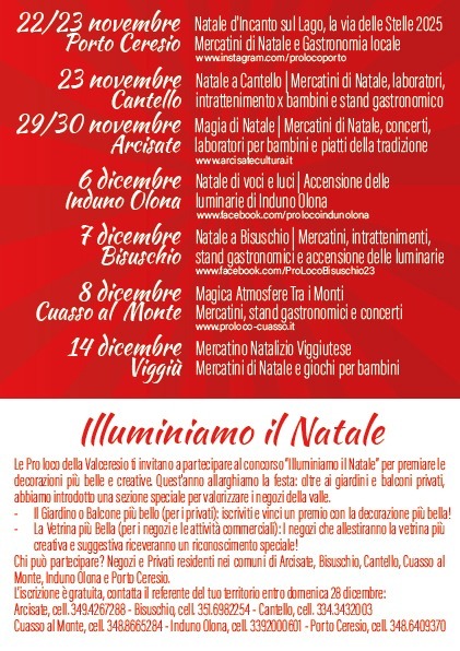 Natale in Valle 2025 nasce quindi proprio da questa sinergia e dalla voglia di fare squadra per il territorio: si partirà il 22/23 novembre con Porto Ceresio per terminare il 7/8 dicembre con Bisuschio e Cuasso al Monte. Nel programma è stata inserita anche la data del 14 dicembre organizzata da Viggiù, a riprova di una collaborazione che si possa estendere a tutti i Comuni limitrofi anche dove al momento non sia presente una Pro Loco attiva.