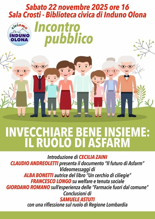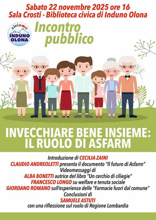 Per questo, la lista Viviamo Induno Olona organizza l'incontro pubblico “Invecchiare bene insieme”, un momento di riflessione su come promuovere un invecchiamento attivo, sostenibile e partecipato.
