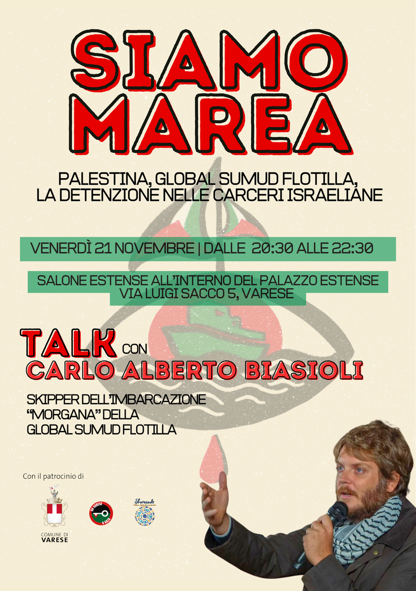 Venerdì 21 novembre, dalle 20:30 alle 22:30, il Salone Estense di Varese, in Via Luigi Sacco 5, ospiterà Carlo Alberto Biasioli, skipper dell’imbarcazione “Morgana” della Global SumudFlotilla.