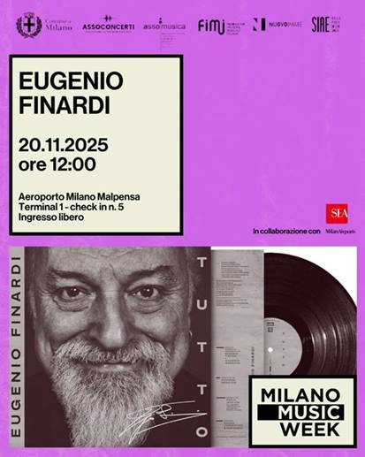 Alle 12, nell’area check-in del Terminal 1, Eugenio Finardi si esibirà in uno showcase esclusivo, proponendo dal vivo alcuni brani tratti dal suo ultimo album Tutto insieme a classici del suo repertorio.