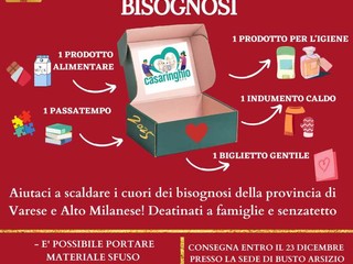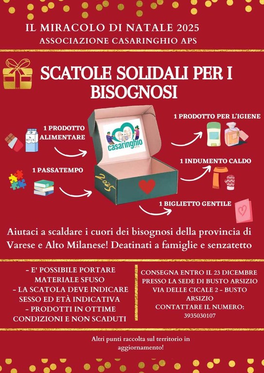 La raccolta delle scatole solidali va avanti fino al 23 dicembre, i punti di raccolta sono la sede di Casaringhio in via Delle Cicale 2 a Busto Arsizio, Pasticceria Tonetti di via per Lonate, sempre a Busto, e Lavatoio Poly di Olgiate Olona (via Delle Libertà 1).