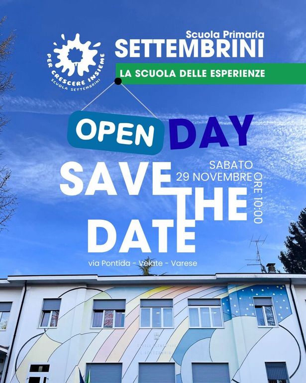 Appuntamento con l’open day della Scuola Primaria Settembrini il 29 novembre dalle ore 10.00 in via Pontida 17, Varese. Si possono seguire le iniziative della Scuola anche sulle pagine Facebook (Associazione genitori Scuola Settembrini Velate) e Instagram (scuola_settembrini_varese).