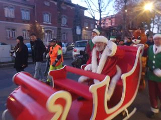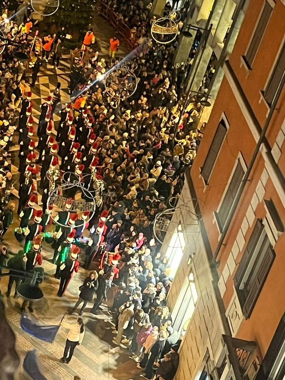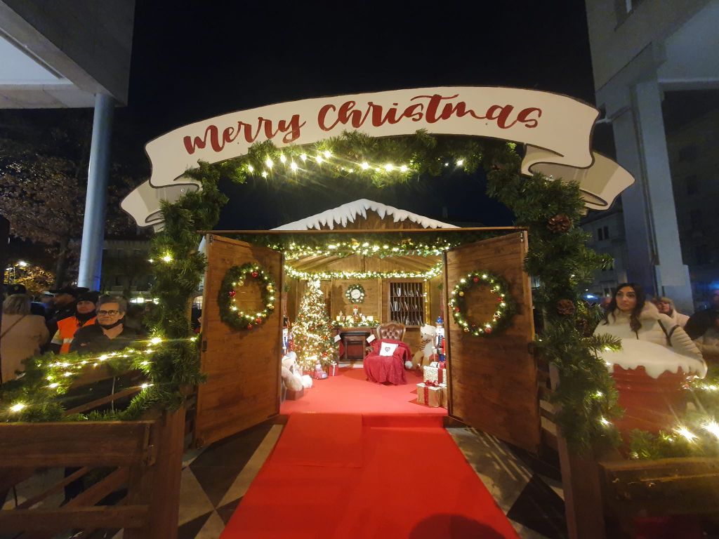 Partita da piazza San Michele, la slitta di Babbo Natale, preceduta dagli elfi e della banda, ha raggiunto piazza Santa Maria, dove ad attenderla c’erano i trampolieri col mantello luminoso.