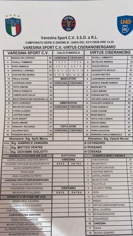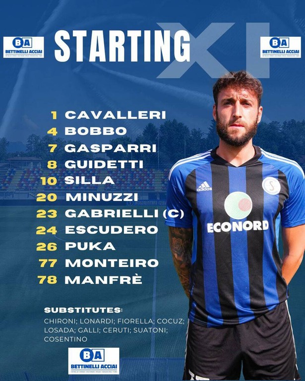 Varesina (4-3-3): Maddalon, Pirola (45’ st Miconi), Caverzasi, Cavalli (38’ st Franzoni), Testa; Andreoli, Rosa, Grieco; Camarlinghi (24’ st Guri), Costantino, Baud Banaga. A disp.: Bovi, Chiesa, Larhrib, Sassi, Ornaghi, Valisena. All: Spilli