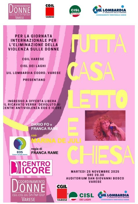 Quanto ci sia da fare per eliminare la violenza sulle donne è sotto gli occhi di tutti. E nella giornata internazionale dedicata all’eliminazione della violenza sulle donne il Coordinamento donne unitario CGIL CISL UIL di Varese, insieme alle federazioni dei Pensionati ha pensato a qualcosa di differente e alternativo come uno spettacolo teatrale tra il comico e il grottesco intitolato “Tutta casa, letto e chiesa” di Franca Rame e Dario Fo, regia di Franca Rame con Marina De Juli.