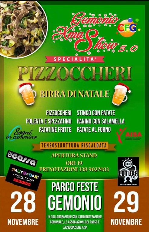 Il Comitato Feste di Gemonio torna con la quinta edizione del Gemonio XmaShow, un appuntamento ormai imperdibile che quest’anno raddoppia ancora: venerdì 28 e sabato 29 novembre il paese si trasformerà in un grande villaggio natalizio fatto di sapori, musica e divertimento.