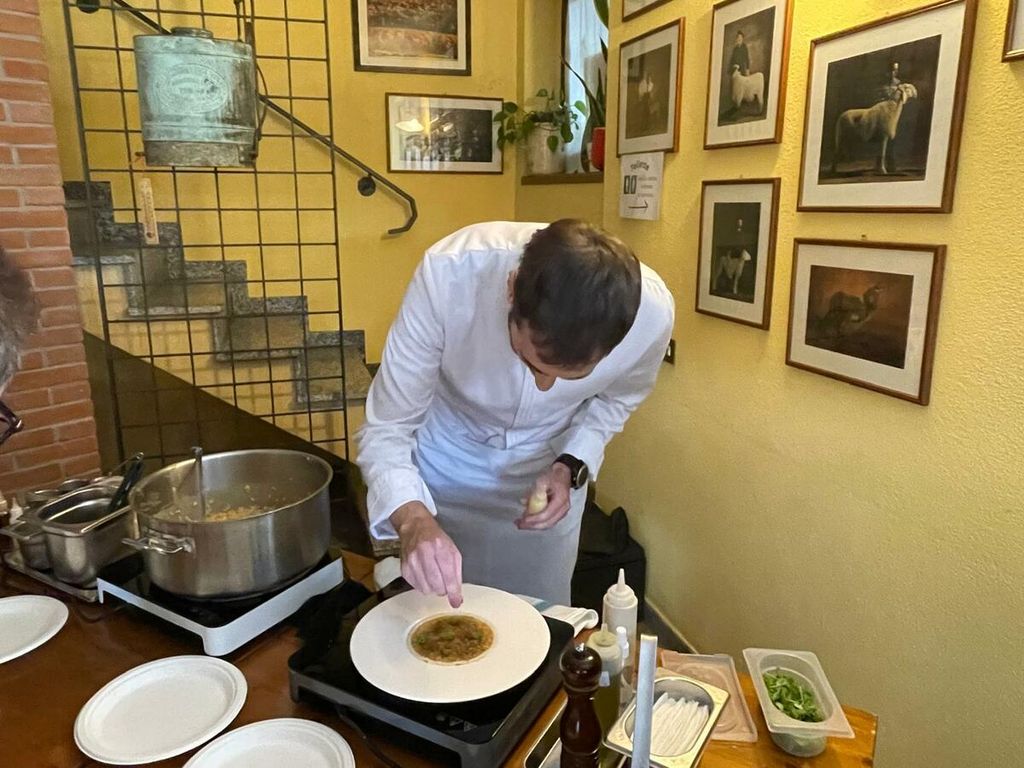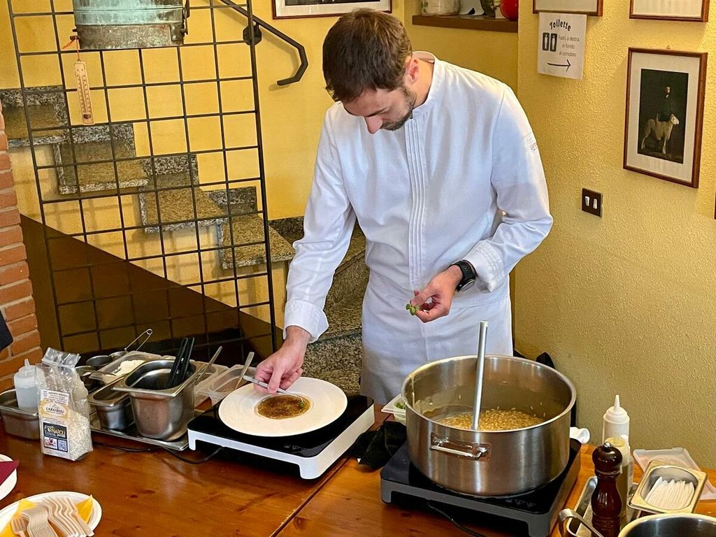 Dopo la degustazione del risotto dello chef Lorenzo Sacchi, è stato offerto un risotto porri e pancetta cucinato direttamente da Il Ronco di Casarico.