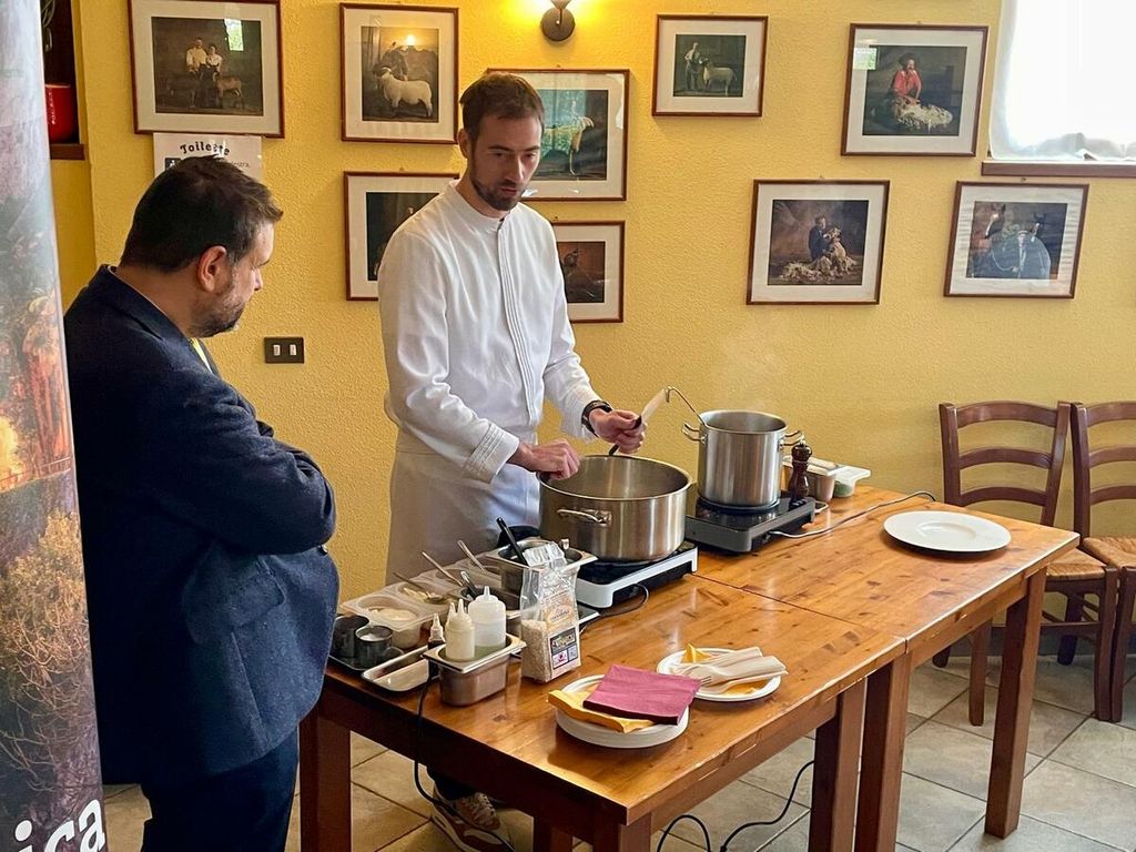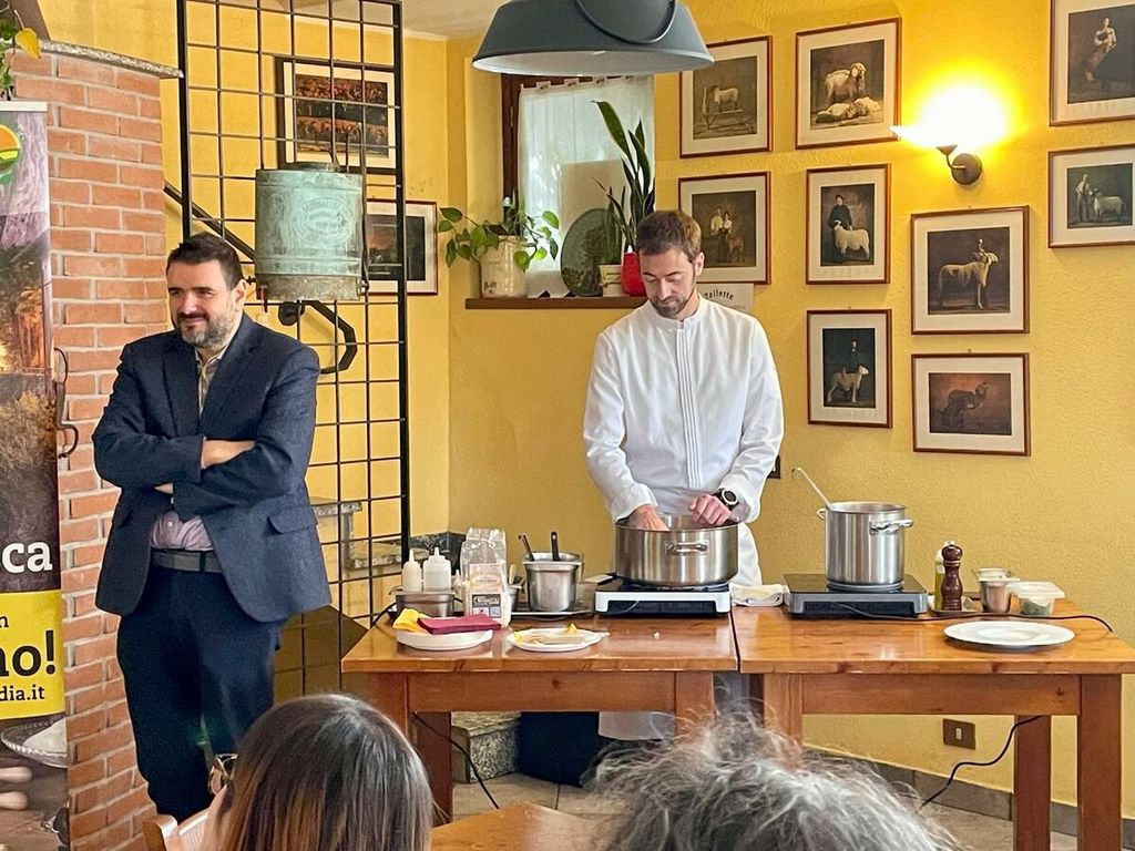 Mentre lo chef Sacchi procedeva con la preparazione del suo risotto, il risicoltore Domenico Carnevali ha illustrato le caratteristiche e i cenni storici del Carnaroli Classico, di cui proprio quest’anno ricorrono gli ottant’anni.