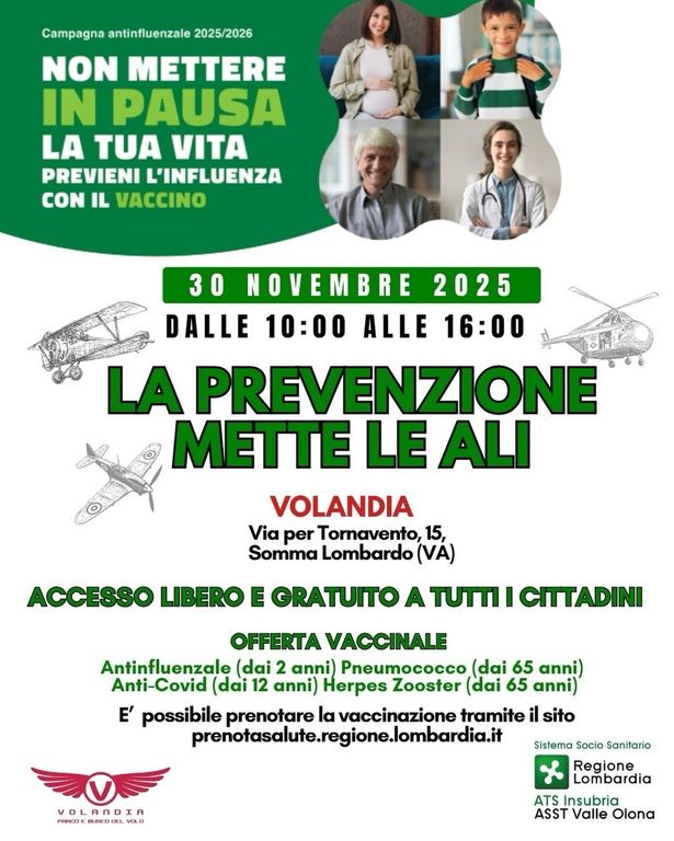 Vaccinarsi a Volandia: sarà possibile domenica 30 novembre, dalle 10 alle 16, grazie all’iniziativa nata dalla collaborazione tra Ats Insubria, Asst Valle Olona e museo del volo (vedi anche locandina completa in fondo). Come già avvenuto con i vax day nelle Case di comunità, l’accesso è libero e gratuito, con possibilità di prenotarsi (www.prenotasalute.regione.lombardia.it) per rendere più regolari e ordinate le operazioni.