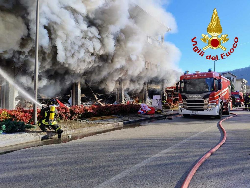 Grosso incendio attorno alle 12.30 di oggi in un grosso esercizio commerciale di via XXV aprile a Laveno Mombello, situato non lontano dal ponte della ferrovia e dalla cartiera.