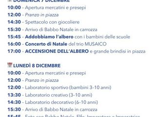 Il clou assoluto della manifestazione sarà domenica 7 dicembre alle ore 17:00, quando Maccagno si riunirà per il tradizionale: COUNTDOWN – ACCENSIONE DELL’ALBERO DI NATALE, con Concerto del trio MUSAICO (violino, chitarra e batteria), e a seguire Grande Brindisi in Piazza.