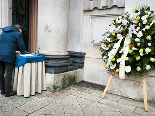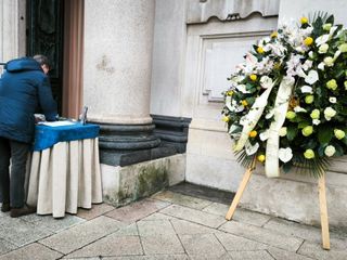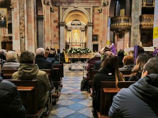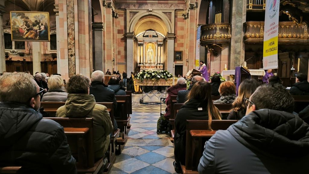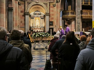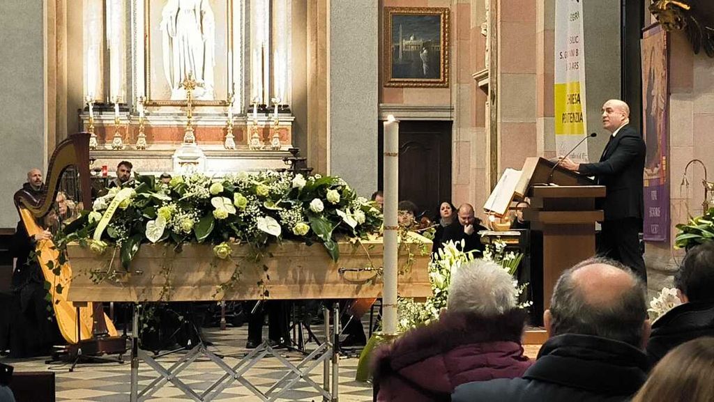 La chiesa era gremita in ogni ordine di posto già molto prima dell'inizio della funzione, con decine di persone rimaste in piedi lungo le navate laterali e sul fondo, in un silenzio rispettoso e carico di emozione. A rendere ancora più toccante l'atmosfera, le note delicate dei musicisti presenti a pochi passi dal feretro, che hanno accompagnato i momenti salienti di una liturgia sobria ma profonda.