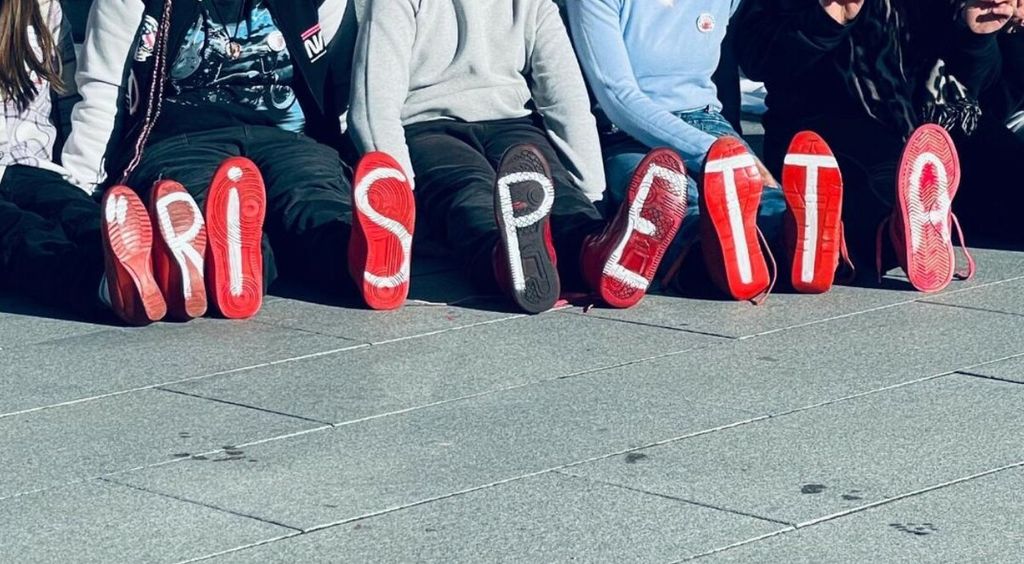 La manifestazione si è conclusa con un monito: una frase, riportata sulle suole dei ragazzi di seconda, seduti in fila a formare le parole: «Rispetta l'altra metà del cielo».