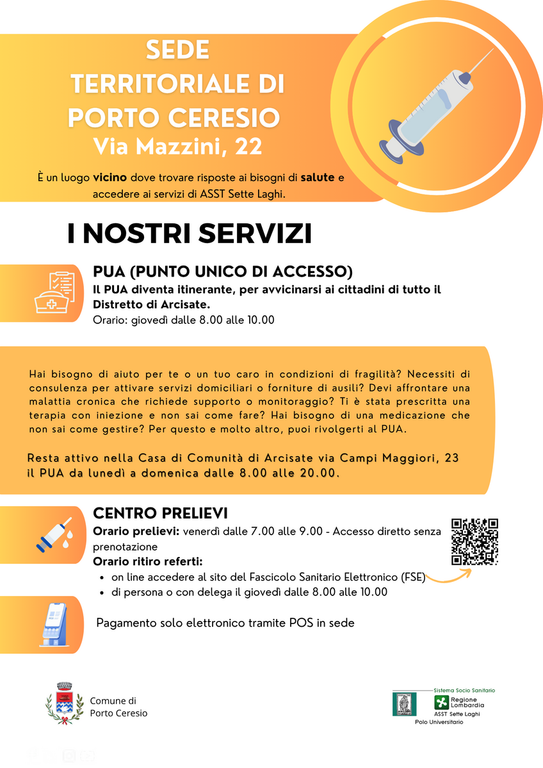 A partire da venerdì 5 dicembre, il Punto Prelievi di Porto Ceresio, situato in via Mazzini 22, sarà riorganizzato, con l’obiettivo di offrire un servizio ancora più semplice, rapido e accessibile agli utenti.