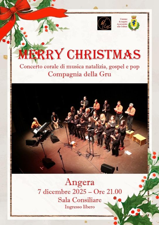 L’Assessorato alla Cultura del Comune di Angera ha organizzato per domenica 7 dicembre 2025, alle ore 21.00, nella Sala Consiliare di Angera, in vista delle prossime festività natalizie, un concerto dal titolo "Merry Christmas", tenuto dal gruppo Compagnia della Gru che eseguirà un repertorio comprendente musica natalizia, gospel e pop.