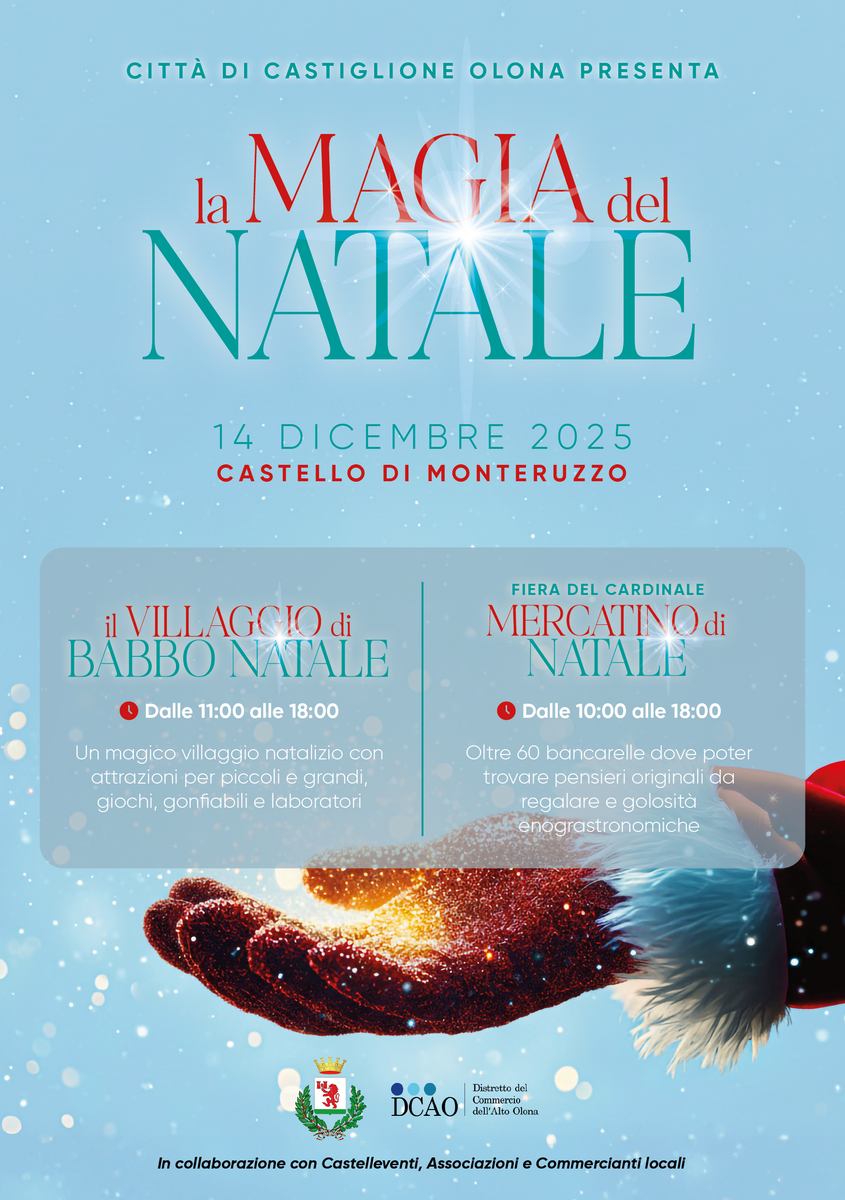 Con questo spirito il Comune di Castiglione Olona organizza, per il terzo anno consecutivo, una giornata speciale per vivere tutta "LA MAGIA DEL NATALE" attraverso un grande evento che si terràdomenica 14 dicembre al Castello di Monteruzzo di Via G. Marconi, 1 e che vedrà la presenza del Villaggio di Babbo Natale e dello speciale Mercatino di Natale della Fiera del Cardinale.