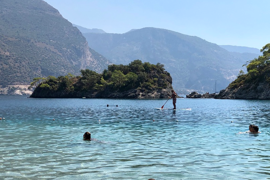 Ölüdeniz si trova sulla costa sud-occidentale della Turchia, lungo un tratto del Mare Egeo che alterna natura protetta e turismo massiccio. La sua identità sta nella convivenza degli opposti. Da una parte la Blue Lagoon, area protetta e a ingresso contingentato, celebre per le sue acque trasparenti. Dall’altra la spiaggia della costa, costruita attorno alle esigenze del viaggiatore. Due estetiche, due ritmi, due idee di accoglienza. Nessuna prevale. La mattina, vicino alla laguna, tutto sembra magico. La vegetazione costiera delimita l’area del parco nazionale e Il colore del mare ha un effetto ottico romantico: sedimenti chiari, fondale basso e flora marina, che restituiscono luce invece di assorbirla. I gesti sono lenti: una tavola da paddle surf che avanza, bambini che raccolgono pietre piatte, barche lontane dalla riva come sospese. L’atmosfera è misurata e la gente parla poco. Alcuni osservano l’arco naturale che chiude la baia, come se quel paesaggio fosse un allineamento cosmico.