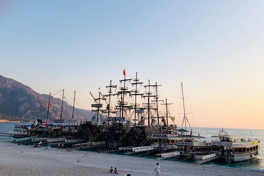 La costa del Mugla alterna calette remote e zone affollate. Ölüdeniz rappresenta uno dei punti in cui questo dualismo è più evidente. Non è un luogo incontaminato, ma un luogo parzialmente addomesticato. La laguna offre contemplazione e silenzio: accessibile, fotografabile, ordinata. È la parte del racconto che procede lenta, come un respiro lungo. Pochi metri più in là, la cittadina spinge nella direzione opposta. Dopo mezzogiorno la musica aumenta, le “navi pirata” imbarcano turisti per i tour costieri e i bar fronte mare si riempiono. Le insegne si accendono in anticipo, ogni attività gareggia per attirare attenzione. La scena è frontale: vitalità dichiarata, commercio, colore. Lo sguardo, qui, è costantemente chiamato a scegliere. È un piccolo bivio, ripetuto decine di volte nell’arco della giornata. Ogni particolare racconta un diverso modo di stare in questo luogo. Molti turisti arrivano dal Nord Europa e dalla Russia: in alcuni periodi la popolazione si moltiplica, passando da poche centinaia di residenti a migliaia di presenze temporanee. Il luogo cambia forma a seconda della stagione, come un organismo che si espande e si ritrae.