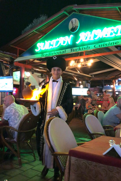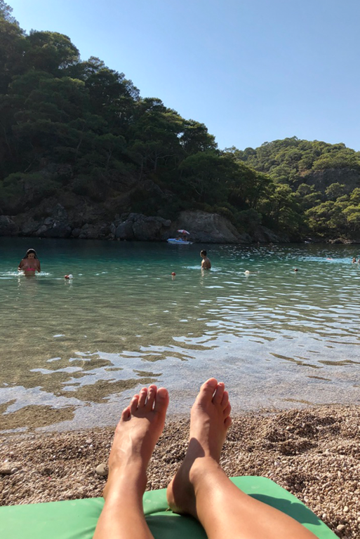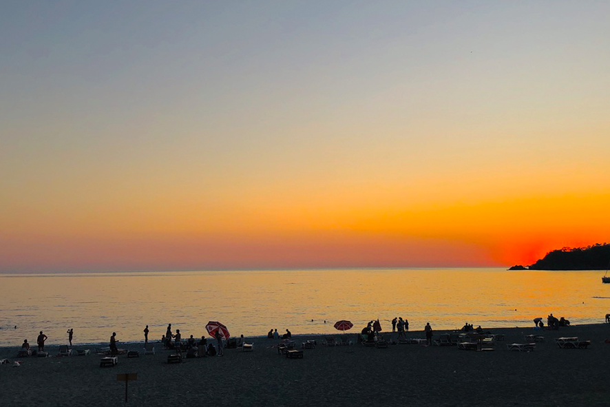Nel pomeriggio la luce si fa opaca e la zona diventa un osservatorio sociale. I gruppi più rumorosi, i solitari, le famiglie organizzate, i venditori itineranti: frammenti di una stessa immagine. La sera restituisce un ordine. I ristoranti preparano la scena: braci accese, kebab, pesce fresco, piatti che arrivano fumanti, porzioni di frutta servite con piccole coreografie. Il cibo è parte del teatro. La spiaggia ormai è vuota, la temperatura scende. Chi cammina sul bagnasciuga vede solo tre elementi: il buio del mare, il profilo delle montagne e la luce della Luna. La notte non cancella il ritmo del giorno: lo distende soltanto. All’alba il paesaggio torna protagonista e l’atmosfera è di nuovo uguale a se stessa. Le famiglie arrivano presto, prima del caldo, prima del frastuono. La natura riprende il suo posto nel racconto, ma senza rivendicarlo. È un equilibrio discreto. Tutto convive, tutto ritorna. Qui passa anche la Lycian Way, uno dei trekking più noti della Turchia, oltre 500 chilometri tra rovine licie, alture e coste. Chi cammina ne percorre dei tratti, per giorni interi; chi resta in spiaggia lo ignora del tutto. Due viaggi paralleli, stesso punto sulla mappa. Ölüdeniz non cerca di essere una cosa sola. Non ha la purezza intatta di un paradiso e non vuole nemmeno averla. È un territorio condiviso tra contemplazione e intrattenimento, tra silenzi brevi e rumori lunghi. La cittadina offre la cornice, l’uomo la riempie a suo piacimento.