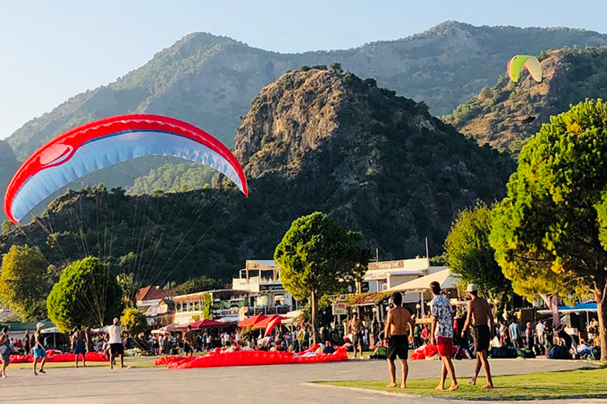 Scendono dalla montagna di Babadağ e atterrano sulla spiaggia. La manovra è rapida: sabbia, ghiaia, un soffio di vento e la vela si piega a ventaglio prima di essere raccolta a terra. La scena si ripete più volte, ogni giorno, davanti alla stessa baia. E’ considerato uno dei migliori siti al mondo per il parapendio: partenze dai 1.200 ai 1.900 metri, vento stabile, vista aperta sul Mediterraneo. Per molti, qui, l’avventura comincia da questa immagine. Un volo che finisce a pochi metri dal mare.