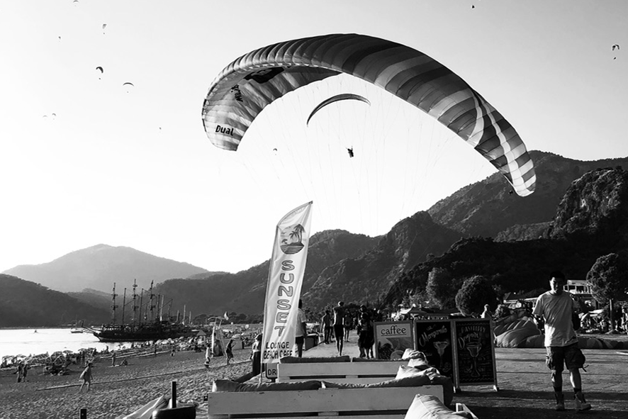 Scendono dalla montagna di Babadağ e atterrano sulla spiaggia. La manovra è rapida: sabbia, ghiaia, un soffio di vento e la vela si piega a ventaglio prima di essere raccolta a terra. La scena si ripete più volte, ogni giorno, davanti alla stessa baia. E’ considerato uno dei migliori siti al mondo per il parapendio: partenze dai 1.200 ai 1.900 metri, vento stabile, vista aperta sul Mediterraneo. Per molti, qui, l’avventura comincia da questa immagine. Un volo che finisce a pochi metri dal mare.