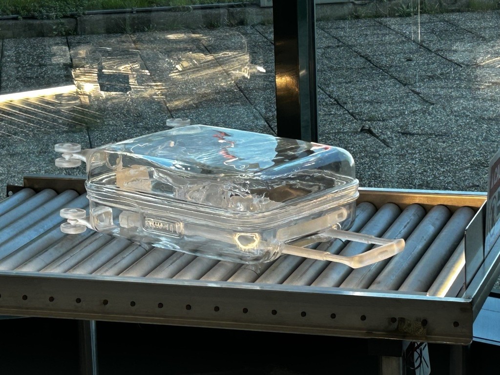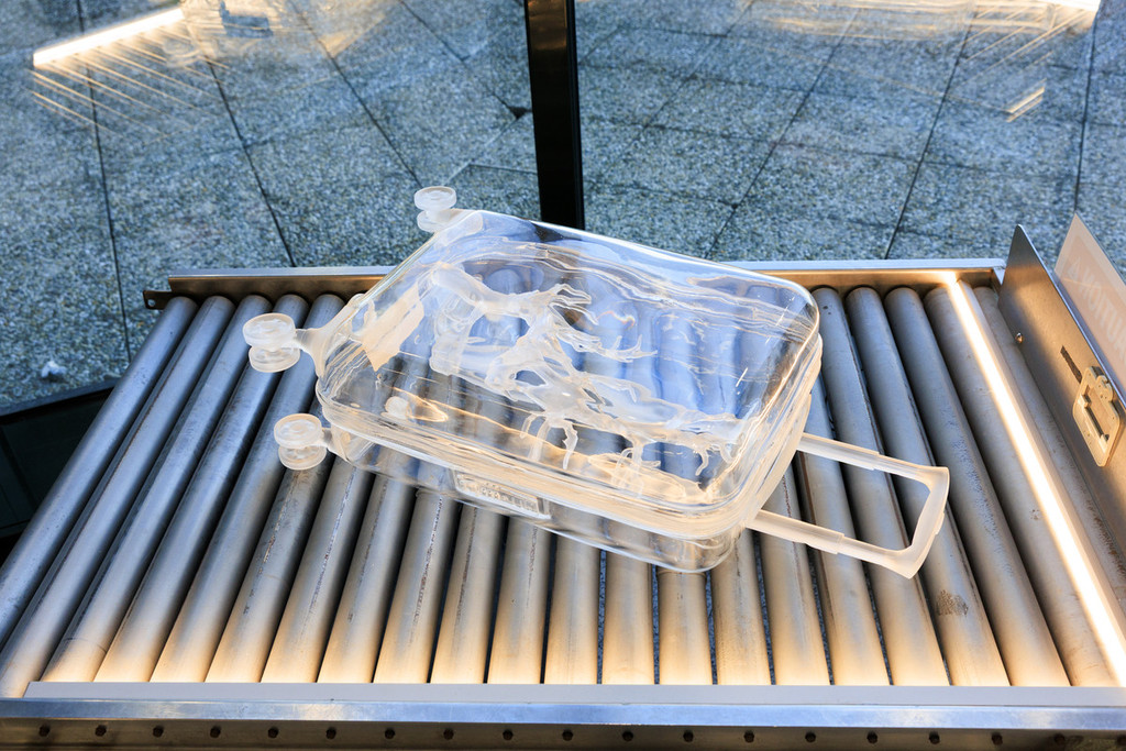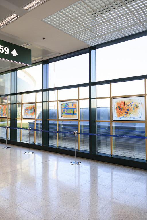 L’installazione pensata proprio per Malpensa, presenta una scultura in vetro di Murano soffiato, alla quale fanno cornice otto opere in stampa diretta a pigmenti UV. Il vetro, traslucido e fragile, amplifica il tema dell’esistenza in transizione: un equilibrio precario che racconta la condizione umana, fatta di radici, spostamenti, legami sospesi.