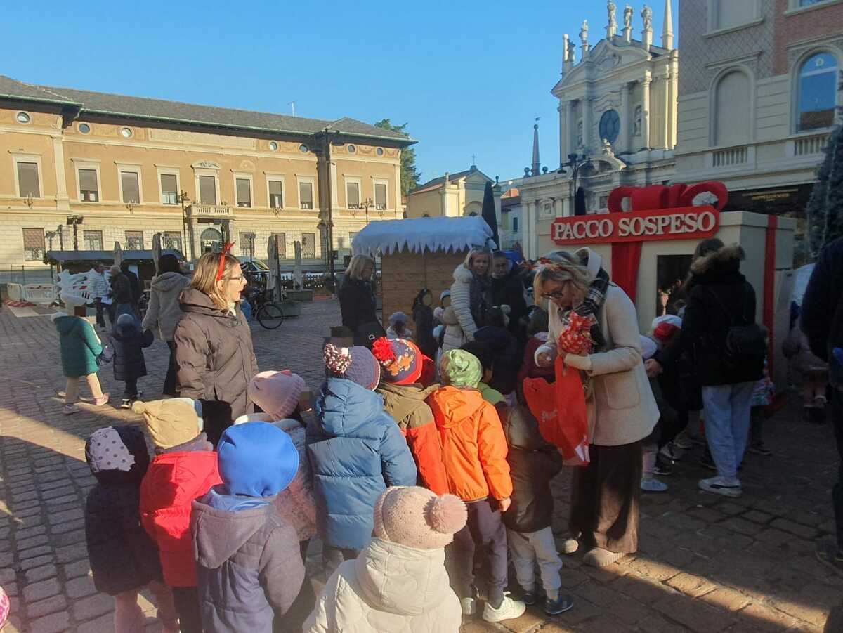 Qualche bimbo si è dovuto alzare sulle punte dei piedi per riuscire a infilare un regalo nello sportello dell’installazione del “Pacco sospeso” in piazza San Giovanni.