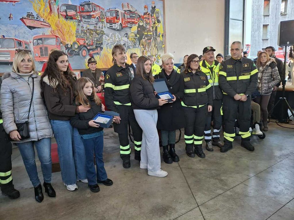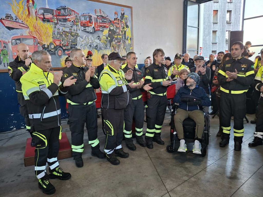 Quando la giornalista Chiara Milani (da oggi vigile del fuoco benemerito, su disposizione del Ministero dell’Interno) ha chiamato le famiglie di Roberto Di Saverio e Alessio Teoldi, due pompieri scomparsi prematuramente, per ricevere un contributo economico, significativo innanzitutto perché segno di vicinanza e affetto, il livello emotivo della manifestazione si è impennato. E ha continuato a salire alla consegna di una borsa di studio alla piccola Chiara Teoldi, figlia di Alessio, otto anni e buoni voti, un po’ frastornata ma determinata ad andare fino in fondo, ad affrontare la prova della folla e dei riflettori. Apice toccato con l’arrivo Devid Ricci, anch’egli destinatario di un contributo economico, 7mila euro raccolti con la festa che i pompieri hanno organizzato a Cassano Magnago, in giugno, per aiutarlo ad affrontare cambiamenti di vita radicali. Devid, costretto su una sedia a rotelle da un infortunio occorso in servizio, a Como, ha ricevuto il riconoscimento con gli occhi lucidi. Ha sussurrato poche parole, sentite solo dai Vigili del fuoco che gli si sono fatti incontro, quasi a circondarlo con un abbraccio di divise, corale.