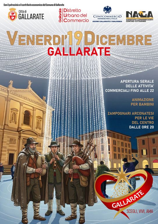 Venerdì 19 dicembre: Gallarate accende il Natale con l’apertura serale dei negozi fino alle ore 22. Gallarate si prepara a vivere una serata speciale all’insegna del Natale, della convivialità e della vita di città. In occasione dell’apertura serale straordinaria delle attività commerciali, il centro cittadino sarà animato da musica, luci ed eventi pensati per grandi e piccoli.