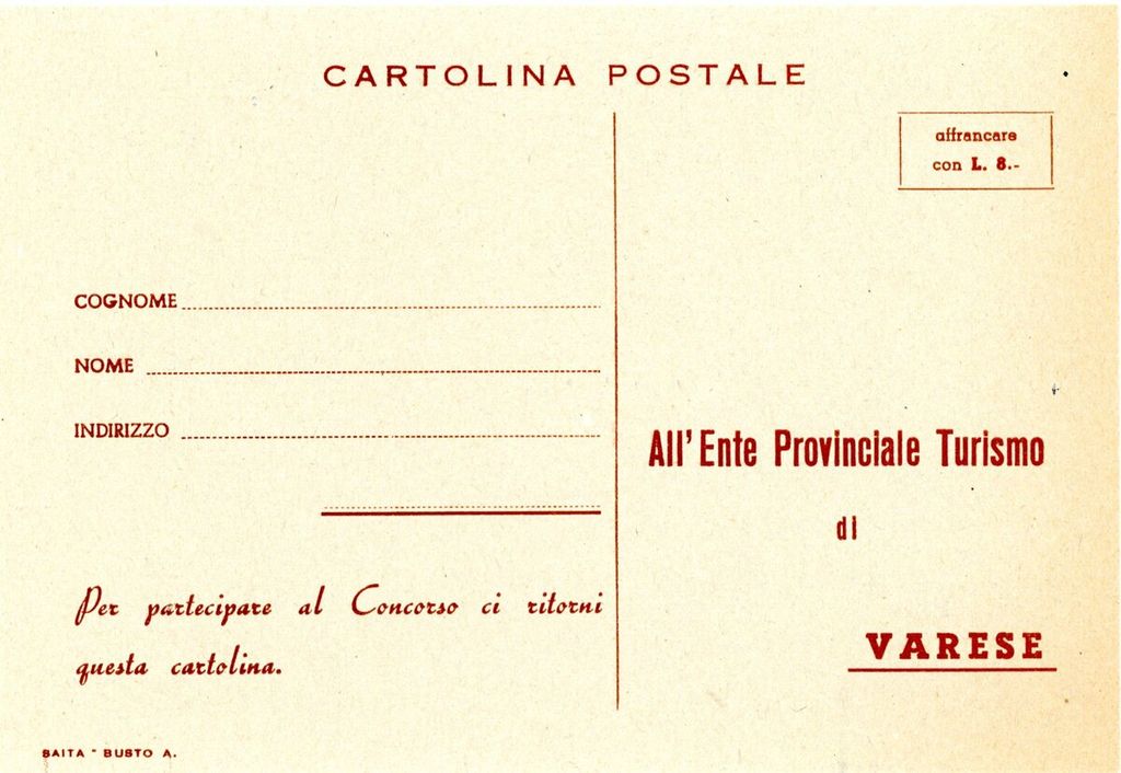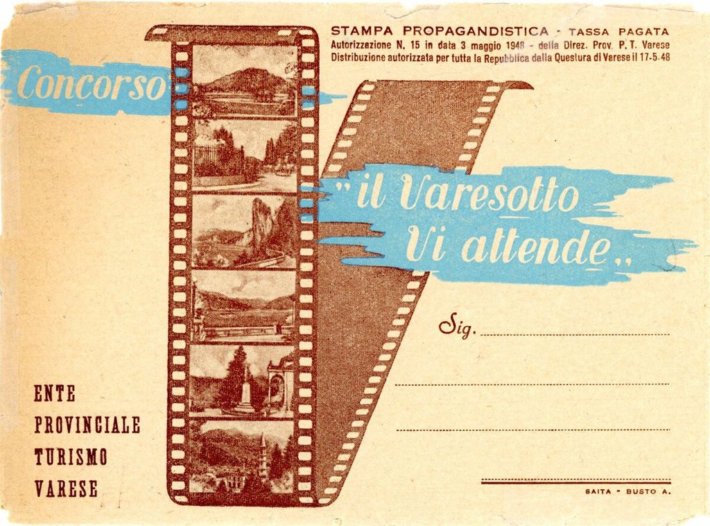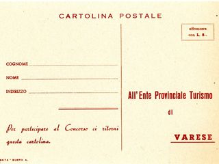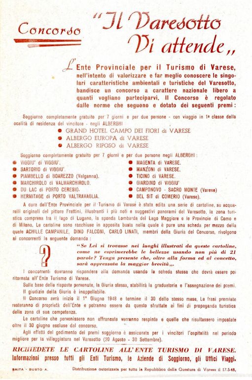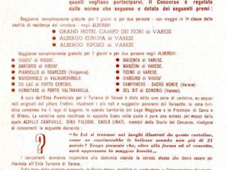 Chi voleva partecipare poteva chiedere la busta con le cartoline direttamente all’Ente turismo di Varese e ottenere informazioni presso tutti gli Enti Turismo, le Aziende di Soggiorno e gli Uffici Viaggi. È interessante leggere poi, in fondo al bando di concorso, che la distribuzione delle cartoline era stata autorizzata «per tutta la Repubblica dalla Questura di Varese il 17 maggio 1948».