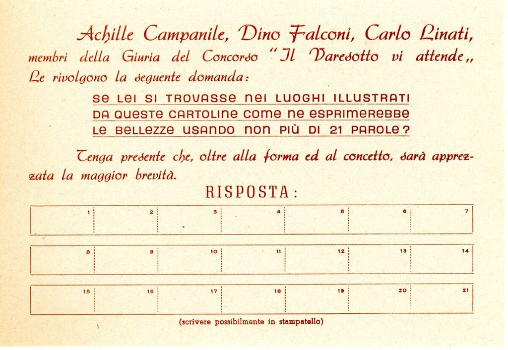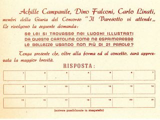 Le sei cartoline erano riunite in una elegante busta contenente il regolamento e una cartolina postale (da affrancare con lire 8) con la seguente dicitura: «Se lei si trovasse nei luoghi illustrati da queste cartoline come ne esprimerebbe le bellezze usando non più di 21 parole? Tenga presente che, oltre alla forma e al concetto, sarà apprezzata la maggior brevità».