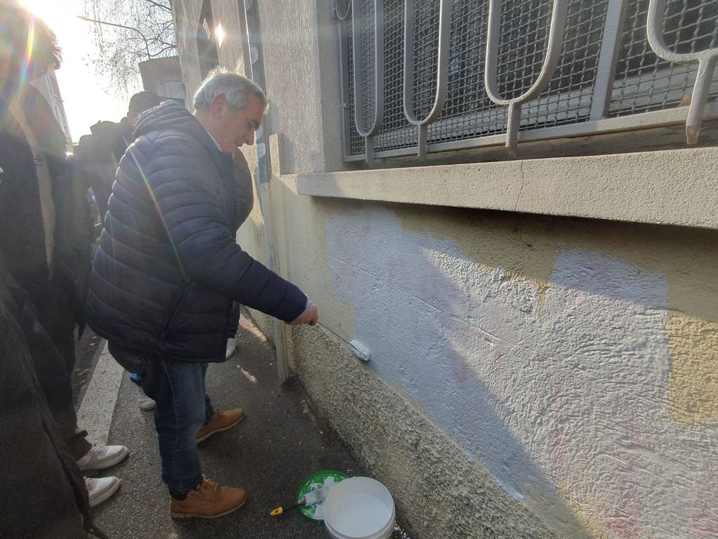 Tanti gli esponenti dei due partiti di centrodestra che questa mattina, domenica 21 dicembre, si sono ritrovati in via Culin per cancellare, con una simbolica staffetta-pennello in mano, le minacce alla presidente del Consiglio: «Spara a Giorgia», con la stella a cinque punte delle Br, le stesse parole con cui, a distanza di qualche giorno, era stato deturpato il muro che separa la sede del Pd di Busto e lo sportello Spi-Cgil.