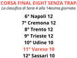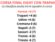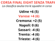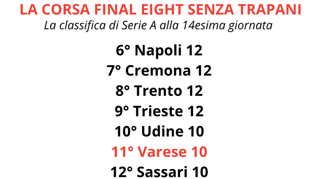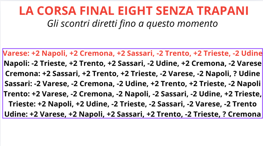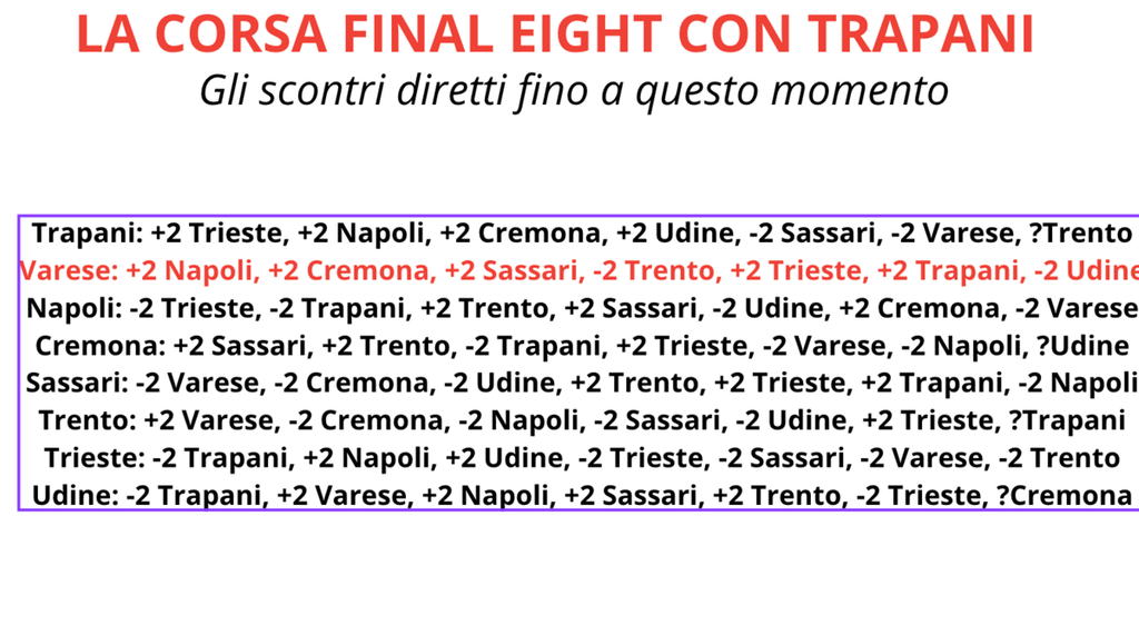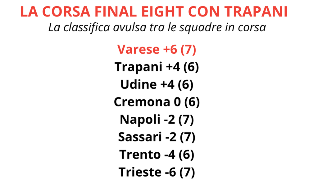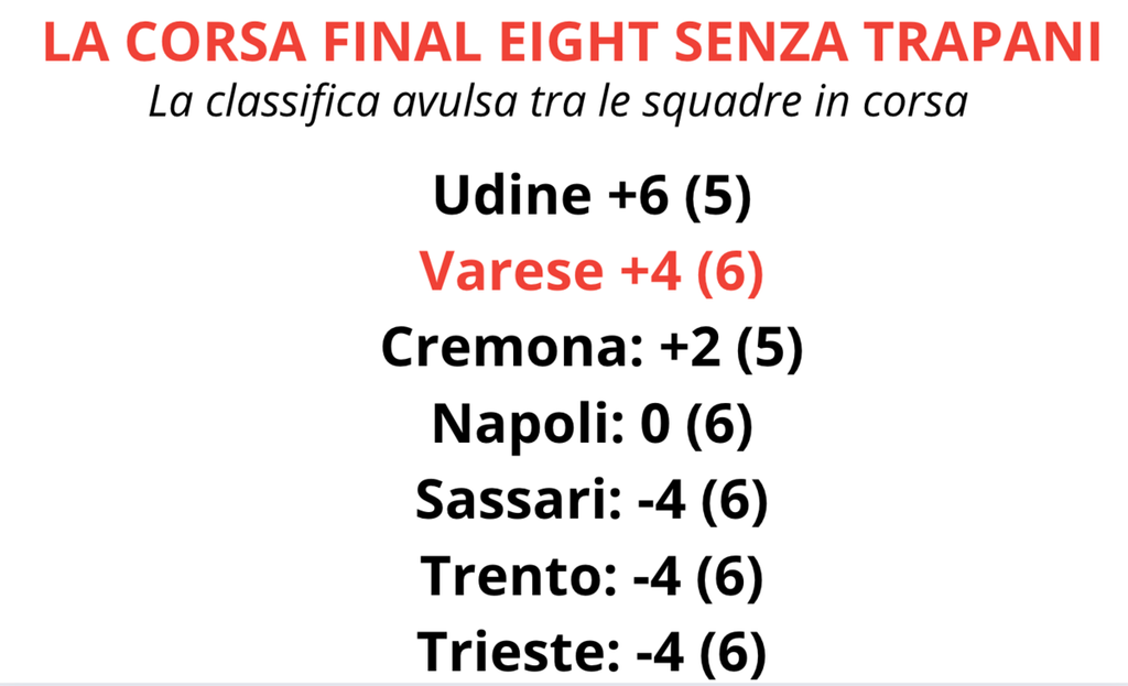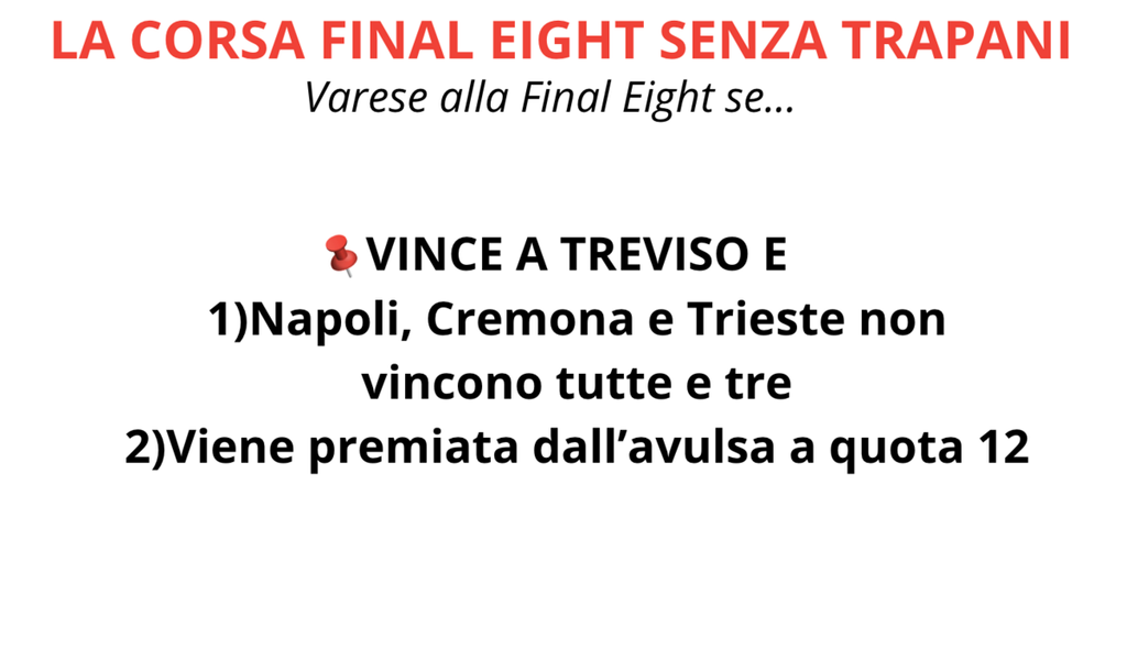 In allegato qui sotto le slide che mostrano le combinazioni della corsa alle Final Eight di Varese con e senza Trapani.