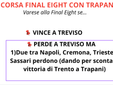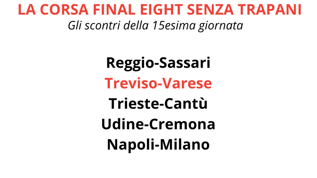 Tutto in una settimana: il sogno qualificazione alle Final Eight di Coppa Italia per Varese si giocherà su due parquet, quello di Treviso, dove la Openjobmetis dovrà assolutamente battere la Nutribullet, e quello di Trapani, dove sarà necessario che gli Shark scendano effettivamente in campo contro Trento. In caso contrario scatterebbe - di diritto - la loro esclusione dal campionato e i prealpini perderebbero i due punti in classifica conquistati contro di loro, evenienza che potrebbe definitivamente frustrare i sogni di gloria di Librizzi e soci.